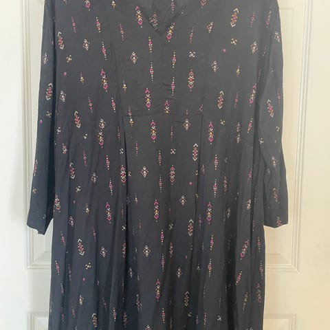 Lite brukt tunika fra Masai, olivengrønn med sort «dyremotiv». Rettigheter løs modell, god i str. Rund og fin hals og 3/4 lange ermer med et ekstra legg
