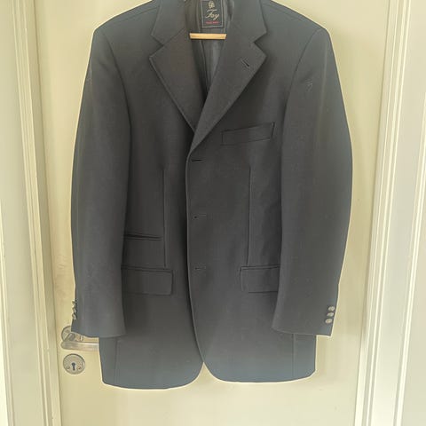 Pent brukt blazer i blå med sølvfargede knapper i størrelse 46 short.