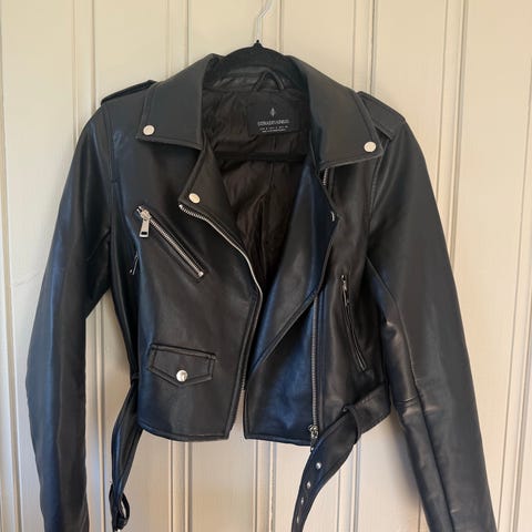 Den har en stor, lun strikket krage og strikkede mansjetter/linning, som gjør den både behagelig og varmere enn vanlige tynne skinnjakker. Perfekt for vår og høst!