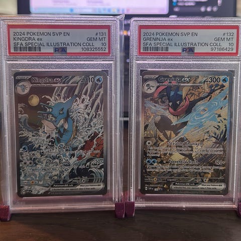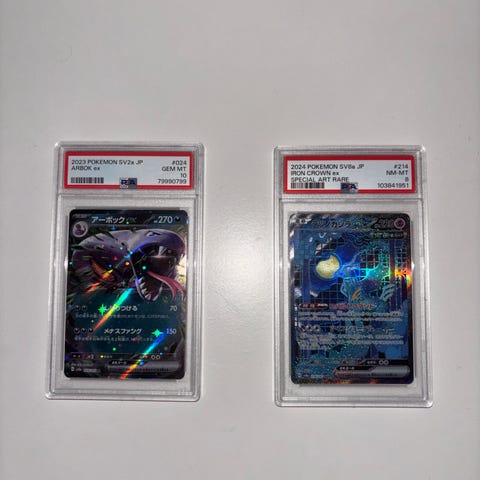 Pokémon Zekrom og Reshiram samlekort fra Classic Collection Black & White-serien. Begge kortene er innkapslet og gradert av PSA, som vist på bildene. Motivet på kortene er Zekrom og Reshiram med holografisk/følende overflate og Pikachu-symbol. Baksiden har standard Pokémon-design med Pokéball. Egner seg som samlekort for Pokémon TCG-samlere som ønsker graderte eksemplarer fra Classic Collection Black & White.