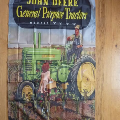 Stooort banner/flagg med Reklame for John Deere selges. Størrelse: Ca. 90x150 cm. Flott å ha i garasjen. Aldri vært i bruk. Laget i polyester. Metallringer i hjørnene for oppheng. Tatt ut av plasten kun for å ta bilde. Bør strykes da det har ligget nedpakket et par år. Kjøper tar frakt.