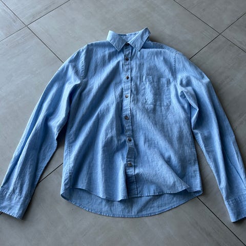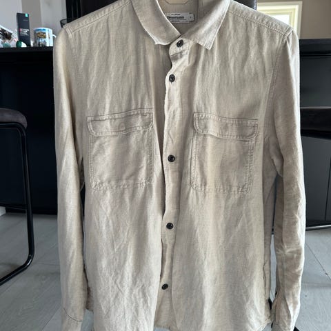 Dressmann skjorte for herre i størrelse S. Skjorten er grønn og laget i 100% lin. Den har lange ermer, knappelukking foran og brystlommer med klaff og knapp. Passer til hverdagsbruk eller uformelle anledninger.