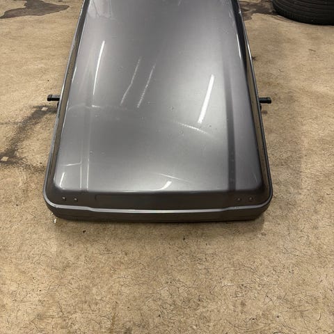 Packline takboks i grå farge. Aerodynamisk modell som monteres på takstativ, egnet for ekstra bagasje på bil. Takboksen har lav profil og passer til de fleste standard takstativsystemer, avhengig av bil og festeløsning. Egnet til oppbevaring av bagasje, ski og annet utstyr på bilturer.