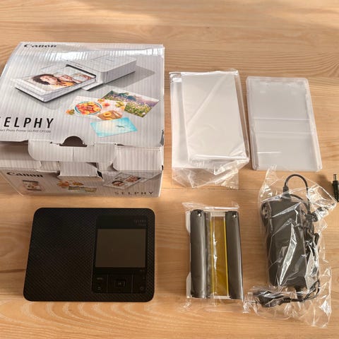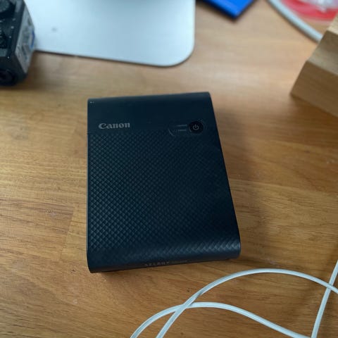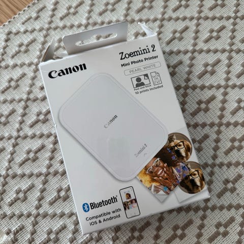 Canon Zoemini fotoskriver i kompakt størrelse. Bærbar skriver som bruker ZINK-fotopapir for utskrift av små bilder direkte fra mobil eller nettbrett via trådløs tilkobling. Enheten har et rosa metallisk design og er egnet for enkel fotoutskrift hjemme eller på farten.