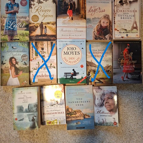Samling med romaner fra ulike forfattere. Bøkene er i pocketutgave og ser ut til å være i sjangeren roman/skjønnlitteratur, flere med romantiske og dramatiske temaer. Selges helst samlet som en pakke med blandede titler og forfattere. Passer for lesere som ønsker en variert bunke romaner i bokhyllen eller til ferielesing.