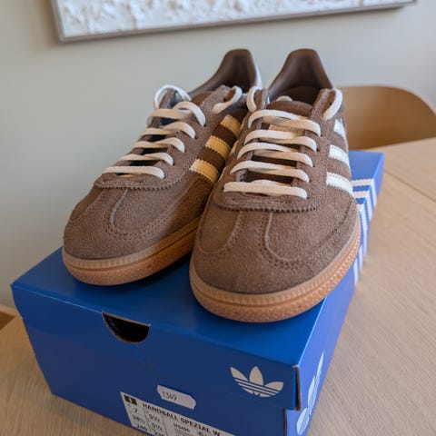 Ubrukte Adidas Spezial sneakers i størrelse 37 1/3. Modellen har overdel i lys beige tone med mørkebrune Adidas-striper og hælparti, samt brun gummisåle. Klassisk snøring foran og lav profil. Nypris 1399🤎