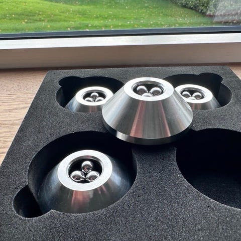 Veldig god kvalitet. Gir meget stødig underlag. Spikes for å sette under med flat bunn.