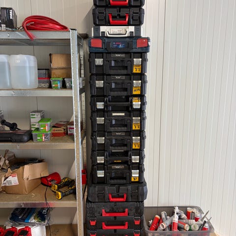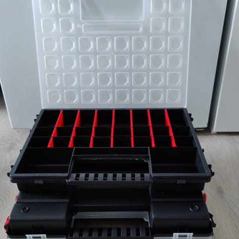 Raaco Safebox sortimentsboks med skuffer. Systemet består av stablebare bokser med uttrekksskuffer og håndtak. Hver boks kan inneholde mindre sortimentsesker for organisering av ønskelig utstyr. De kan stables og festes oppå hverandre. Praktisk i garasje og bil, og eskene kan tas ut og bæres med.