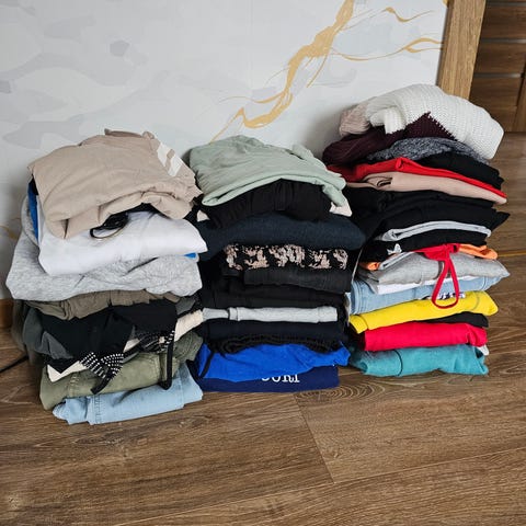 Selges helst samlet, men kan deles opp om man ønsker det. Hvis klærne ikke selges blir de sendt på Fretex. Alle klærne blir vasket godt før de sendes, eller hentes.