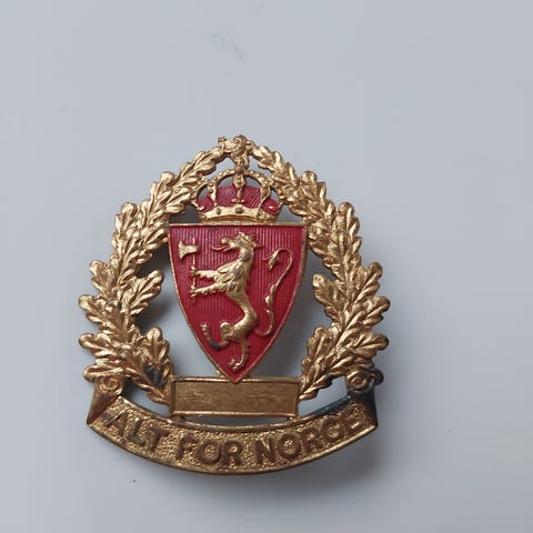 Norsk riksvåpen emblempin i metall, gullfarget. Pin med motiv av riksvåpenet med løve og krone. Festes med nål og skrulås på baksiden. Egnet som uniformsemblem, samleobjekt eller til dekorasjon på klær, vesker eller lignende. DENNE ER SPESIELL SIDEN DEN HAR LILLE LØVE PÅ TOPPEN AV KRONEN OG IKKE ET KORS.