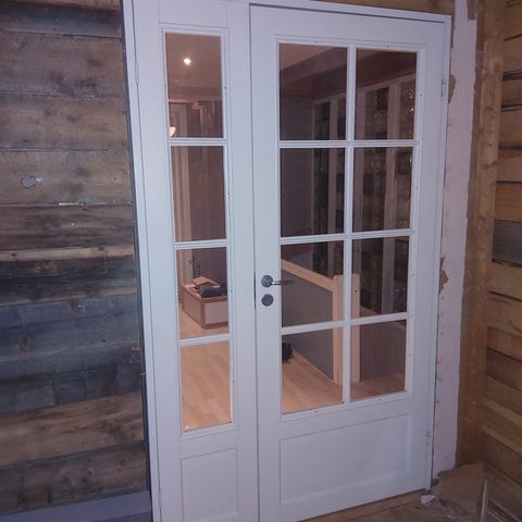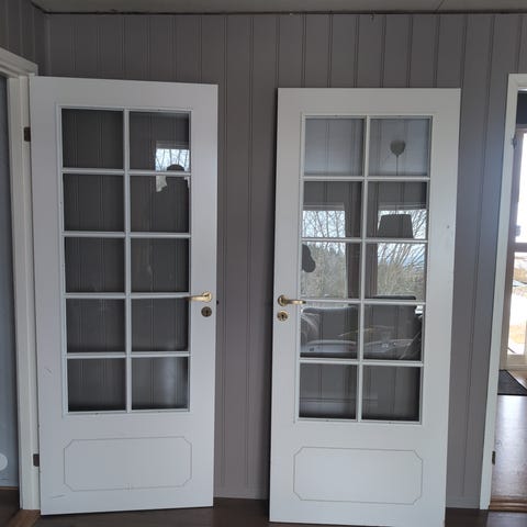 Dobbelt glassdør for innendørs bruk i hvit utførelse. Dørene har sprosseinndelte glassfelt som slipper lys mellom rom, samt tette felter nederst. Leveres med håndtak og låskasse montert på den ene døren. Passer som romdeler eller mellom stue, kjøkken eller gang der man ønsker visuell kontakt og lysgjennomgang samtidig som rommene kan adskilles.