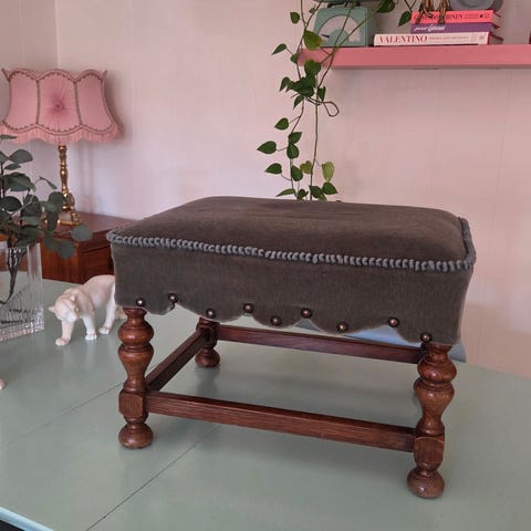 Vintage krakk/fotskammel med oppbevaring. Den er trukket i nytt stoff, beige/natur møbelboucle, ubrukt ved salg. Messingbånd nederst på beina. Har bruksmerker etter et langt liv, men er i god vintage stand.