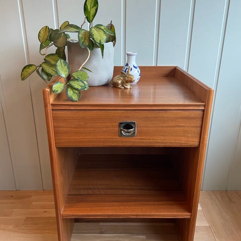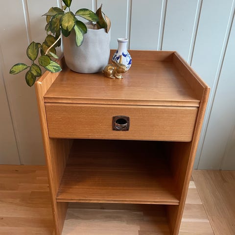 Nydelig fineste sybord som kan brukes som nattbord, sidebord, liten kommode osv. To skuffer; den øverste er minst og har plass til sortering av småting, denne kan ev fjernes for å få en vanlig skuff. Den nederste er dyp og romslig. Noen bruksmerker her og der, men er et flott lite møbel.
