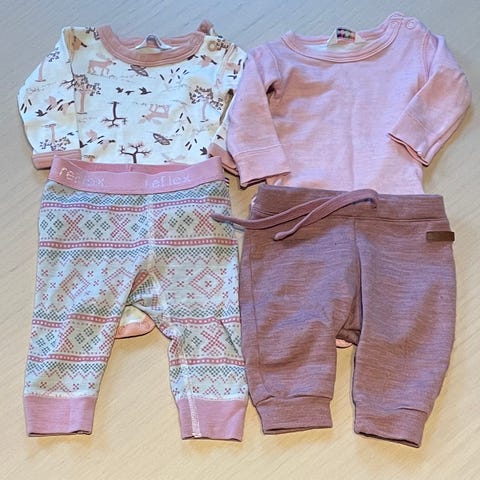 Klær i ull str 56 selges samlet for 400. Den mørke rosa buksen til høyre er 62/68 men jeg synes strikken i livet er stram på den.