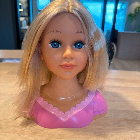 Sminkedukke med blondt hår. Dukkehode beregnet for lek og øving på hårstyling, som børsting, fletting og oppsett. Passer til barn som liker rollelek og hårfrisering. Dukken har skulderparti med rosa topp og langt, lyst hår som kan styles på ulike måter.