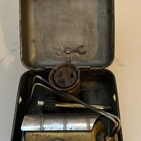 Turkjøkken med integrert drivstofftank og brenner montert i en firkantet metallkasse. Kassen har bærehåndtak og fungerer som både beskyttelse under transport og som vindskjerm ved bruk. Egnet til matlaging og oppvarming på tur, camping eller i felt. Leveres med tilhørende verktøy som vist på bildene. Ikke testet. Må hentes på Kløfta.