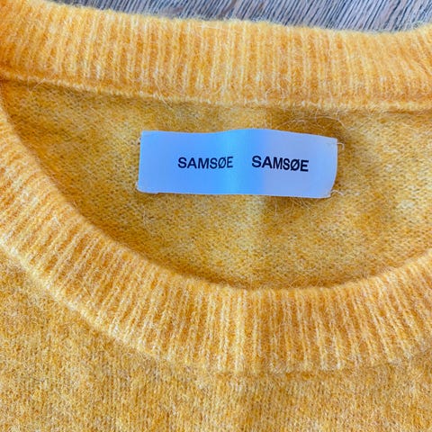 Samsøe Samsøe genser for dame i størrelse S. Genseren er blå og strikket i merinoull. Den har lange ermer og rett fasong, med enkel og ren design. Kostet 1700, selges 800,-.