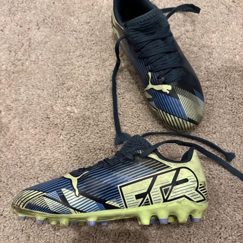 Puma fotballsko for spill på gress. Skoene har knotter under sålen og snøring foran. Overdelen er i syntetisk materiale i neon gul farge med kontrastsømmer og Puma-logo på siden. Passer til fotballspill på naturgress eller faste underlag. Størrelse 30.