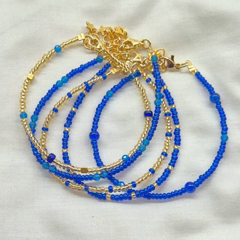 Kjempefine, nye og håndlagde armbånd i ulike glassperler og farger selges. Hovedsakelig rocaillesperler, med innslag av andre glassperler. Gull, turkis, hvite og gule nyanser. Perler og gullforgylte smykkelåser av god kvalitet.