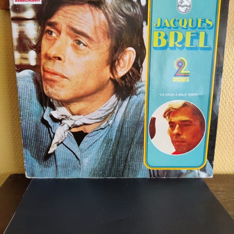 Jacques Brel Is Alive and Well and Living in Paris vinylplate. Original musikalinnspilling med sanger basert på Jacques Brels musikk. Albumet er utgitt som LP med omslag som viser tittel og informasjon om spor på for- og bakside.