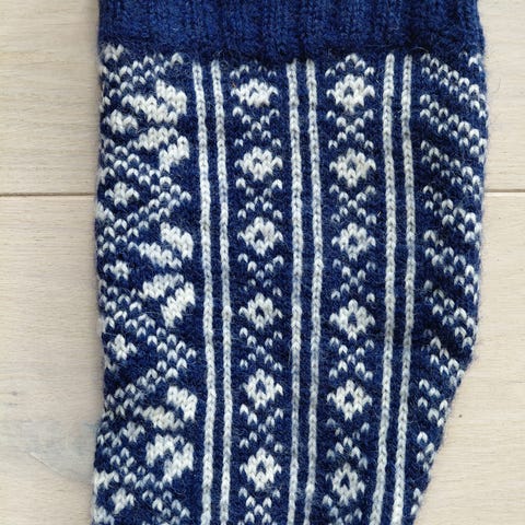 Hjemmestrikket genser i størrelse XL. strikket i alafosslopi. Lyseblå, hvit, marine og grønn.