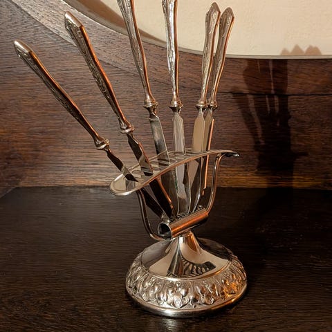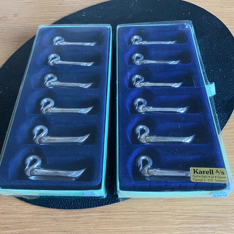 Dette er klassiske knivstøtter i metall (sølvplett), litt tunge og solide – akkurat slik en selvrespekterende svane skal være. Leveres i original eske.