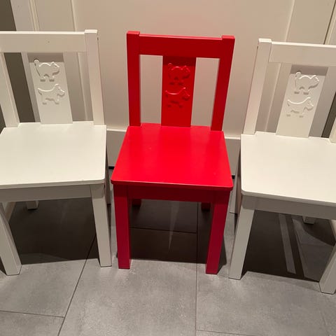 Min datter selger tre superfine rosa små stoler til barn, snekret på Bugårdssenteret i Sandefjord.