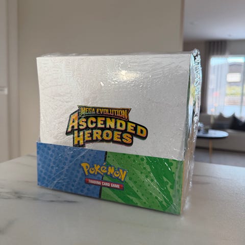 Selger flere sealed Pokémon Ascended Heroes ETBs, Mini tin displays og Booster packs.