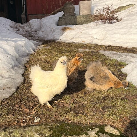 De grå silkene er ca 15 mnd gamle, samme med hanen, mens de hvite hønene er 12 mnd.