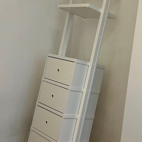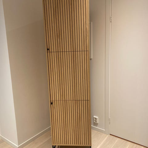 Del 1: 3 skobrett 40 cm, 2 skobrett 80 cm, en skuff 80cm, 4 hyller 40 cm og 1 hylle 80cm. 36 cm dybde på hele og totalt 134 cm bredde. Høyden er justerbar fra 222-350cm i følge ikea (montert ved 240cm takhøyde). Speil kan medfølge etter avtale.