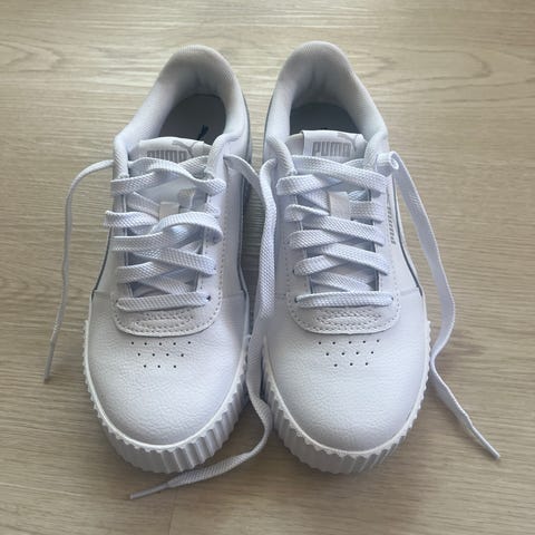 Puma joggesko for jente i størrelse 37. Skoene er i hovedsak hvite med lilla Puma-logo og detaljer på siden. Modellen har snøring foran og perforeringer i tåpartiet for bedre ventilasjon. Yttersålen er mønstret for bedre grep. Egnet som fritids- og hverdagssko for barn/jente som bruker sko i størrelse 37.