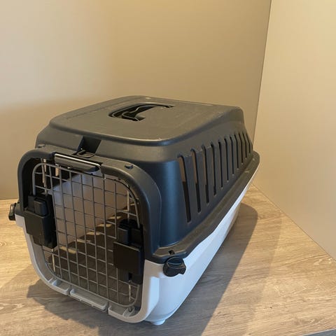 Transportbur til katt eller liten hund i hard plast i fargene grå og hvit. Buret har metallgitter i front med to plastlåser på sidene for sikker lukking. På toppen er det bærehåndtak og en ekstra åpning/luke som kan brukes for tilgang til dyret uten å åpne hoveddøren. Sidene har ventilasjonsåpninger for lufting. Egnet til transport av mindre kjæledyr, for eksempel til veterinærbesøk eller reiser i bil.