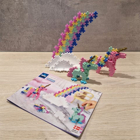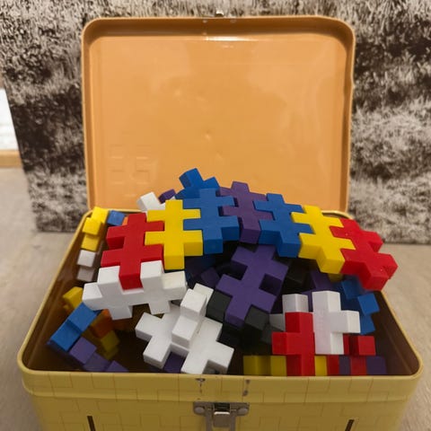 Et rør med små plus plus. Med dette settet man kan man for eksempel sette sammen en havfrue. Det følger med bruksanvisning oppi. 100 brikker.