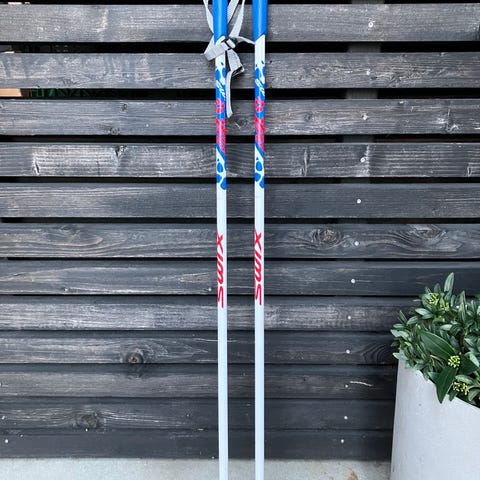 Swix Kalle skistaver for barn. Stavene er blå med fargerike detaljer og har håndtak med reimer i rødt og blått. Trinsene er runde og hvite, egnet for bruk i preparerte løyper. Passer til langrenn for barn. Teipet håndtak