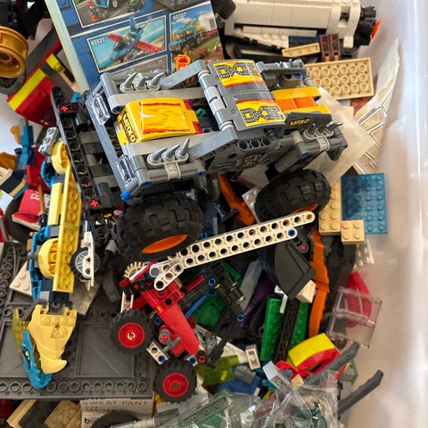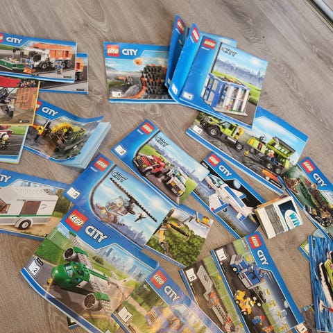 LEGO City byggesett og løse klosser. Blandingen inneholder ulike LEGO City-elementer, inkludert politistasjon, stort skip som ikke er ferdigbygd, helikopter osv. Legger ved instruksjonshefter. Noe legofriends også, men absolutt mest Lego city.