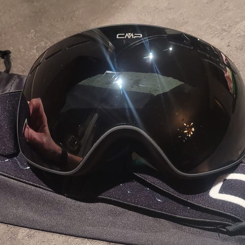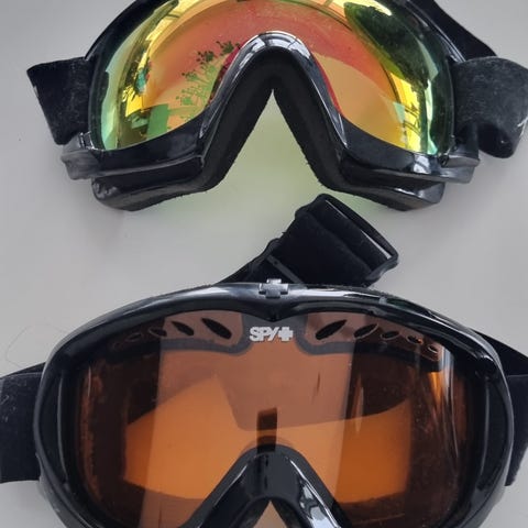 EQPE skibriller med speillinse. Brillene har stor, buet linse med rød/oransje speilfarge. Ramme og stropp er svarte med EQPE-logo i hvitt. Skum rundt rammen for komfort mot ansiktet. Egnet til bruk i alpinbakke og annen vintersport.