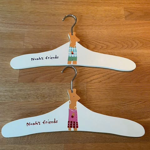 kleshengere for barn i hvit farge med stjernedekor i ulike farger på midten. Hengerenes størrelse er tilpasset barneklær. Passer til oppheng av blant annet gensere, jakker og kjoler i garderobe eller på klesstativ på barnerom.