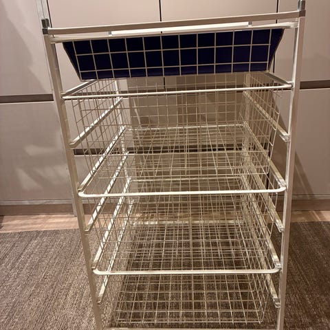 Grå trådkurv med hjul fra IKEA. Tapet en plass på toppen for å holde på plass. Ellers i fin stand.
