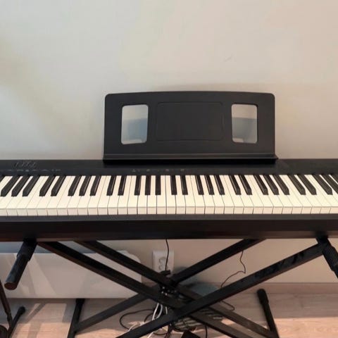 Digitalpiano med fullt klaviatur, stativ og tredelt pedalsett. Egnet for øving hjemme, undervisning eller akkompagnement. Pianoet har integrert notestøtte og separat pedalbrett med sustain-, soft- og sostenuto-pedal. Passer for både nybegynnere og mer erfarne pianister som ønsker et kompakt instrument med fast plassering i rommet.