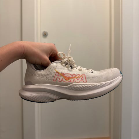 Saucony Endorphin speed 5 løpesko i størrelse 37. Skoene har overdel i pustende mesh i hvit med lilla og rosa detaljer. Mellomsålen er høy og gir god demping, og yttersålen har gummipartier for grep. Modellen er utviklet for løping på asfalt og lignende underlag. Passer til trening og løping der man ønsker en lett og responsiv sko.