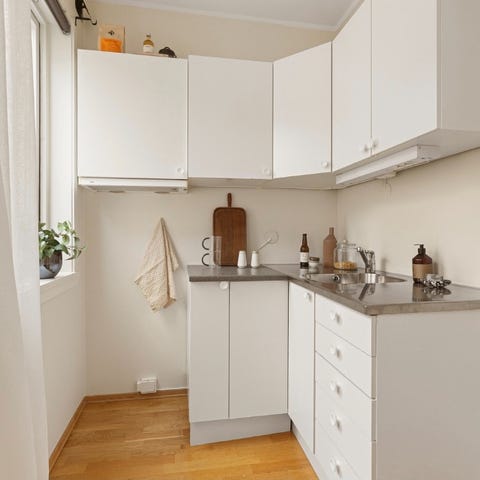Kjøkkenet er i dag montert i en L med lengst benkeplate der platetoppen er. Vegg til vegg 305cm. Benkesiden med vask måler 235,5cm til sidevegg. Her er det i dag plassert et frittstående kjøleskap ved siden av. (Medfølger ikke, men kan kjøpes for en billig penge en uke eller to etter påske om man ønsker det.)