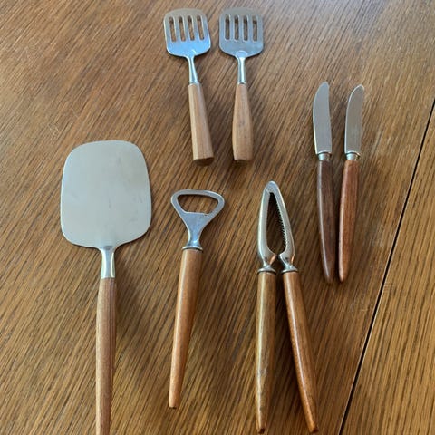 Lindshammar bestikk i rustfritt stål og glass, designet av Christer Sjögren. Produsert i Sverige. Ostehøvel, ostekniv, smørkniv og salatbestikk.