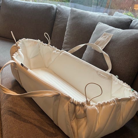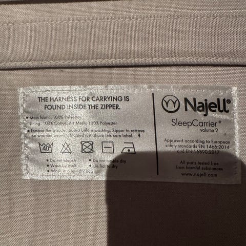 Najell SleepCarrier X limited edition med blomster brodert på den ene siden og en blomst brodert på håndtaket. Det er pent, men mye brukt da hun kun ville sove i dette om natten de første 6 mnd. Følger med vanntett bunntrekk.
