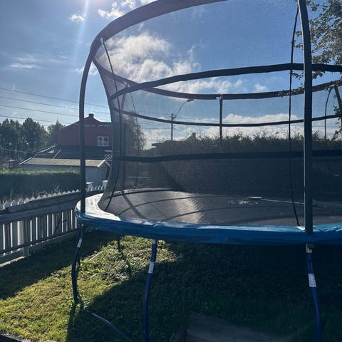 Trampoline gis bort grunnet flytting. Tre små hull i nettet som sikkert fortsatt kan repareres. Ligger demontert foran huset, må hentes på Randem i dag innen 18:00 ellers går den på dynga.