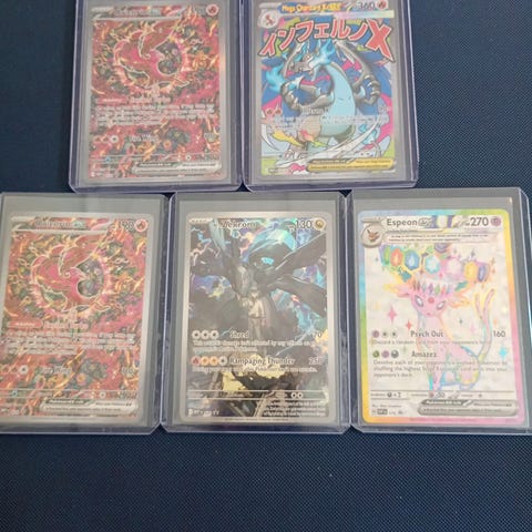 Selger vekk fra samlingen, og selger derfor unna samlingen av promokort av pokemonkortene. Kortene er fra Scarlet-Violet generasjonen. Alle kortene er enten markert som et promokort, eller er et kort med holovariant som kun finnes i esker eller ETB-er. Kortene selges individuelt til dagsverdi ut ifra pricecharting sin nettside ELLER alle gjenværende kort til gjennomsnittet 20kr per kort (1200 for alle 62 kort).