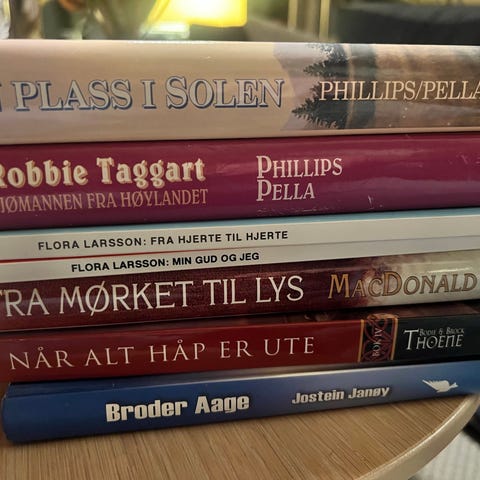 Blandet lot med kristne romaner og seriebøker av ulike forfattere. Bildene viser blant annet pocket- og innbundne bøker innen kristen skjønnlitteratur, inkludert serieromaner og enkeltstående titler. Bøkene er på norsk og egner seg for lesere som ønsker kristen fiksjon og oppbyggelig litteratur. Antall titler og spesifikke serier fremgår av bildene i annonsen.