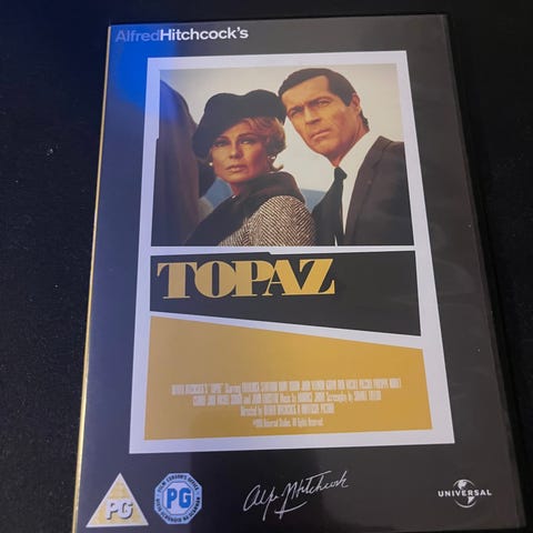 Alfred Hitchcock Topaz DVD. Filmutgave utgitt av Universal med John Forsythe og Frederick Stafford i hovedrollene. Standard DVD-format egnet for avspilling på kompatible DVD-spillere.