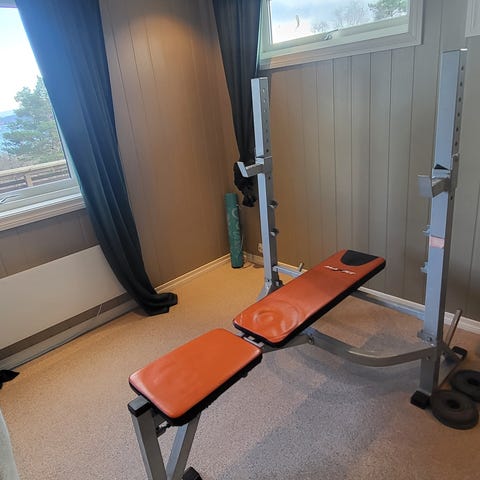 Stativ for styrketrening med vektstang og vektskiver. Stativet har justerbare sikkerhetsstenger og flere høydeposisjoner for vektstangen. Det er også integrert kabel-/taljesystem for øvelser med trekk. Vektstang og ulike vektskiver følger med, samt feste for oppbevaring av vektskiver på sidene av stativet. Egnet for styrketrening hjemme eller i mindre treningsrom. Pressbenk.
