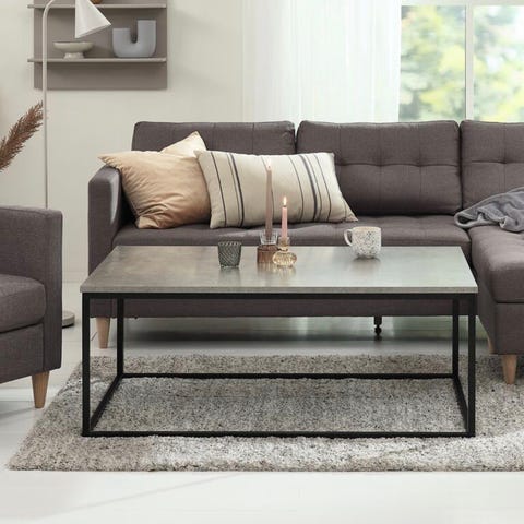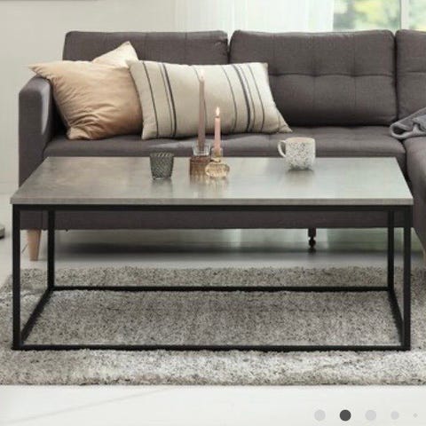 Industrielt og stilrent salongbord, med betong-foliert bordplate og sorte stålben.