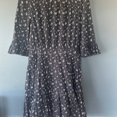 Vero Moda Fiona kjole i størrelse S. Kjolen er svart med mønster/hvite blomster og har 3/4-lange ermer. Den er laget av viskose, som gir et mykt og lett materiale. Modellen har egentlig et stoffbelte/snor i livet, men dette mangler. Kjolen har nydelig krave, volangdetaljer nederst og glidelås på ryggen.